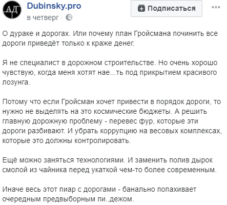 Иначе весь этот пиар с дорогами банально попахивает очередным предвыборным пи..дежом", – написал Дубинский в Facebook. Источник