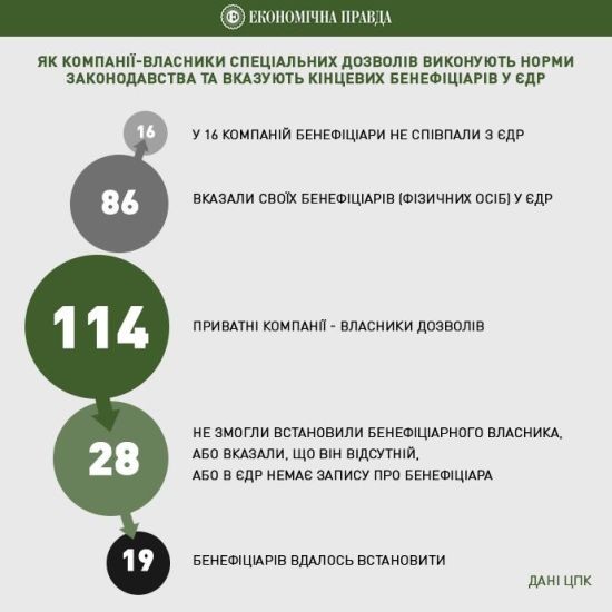 Из них 267 принадлежат госкомпаниям, а 204 обладают 114 частных компании. По расчетам журналистов «Украинской правды» (УП), одиннадцать публичных деятелей Украины обладают четвертой частью (107) всех выданных в стране нефтегазовых разрешений (из 474). Это пять крупнейших олигархов страны: И. Коломойский, Г. Боголюбов, В. Пинчук, Р. Ахметов, П. Фукс. К ним примыкает экс-министр Н. Злочевский и пять народных депутатов, капиталы и соответствующее влияние которых помельче: В. Новинский, И. Котвицкий, Л. Козаченко, Е. Звягильский и скандально известный А. Онищенко.