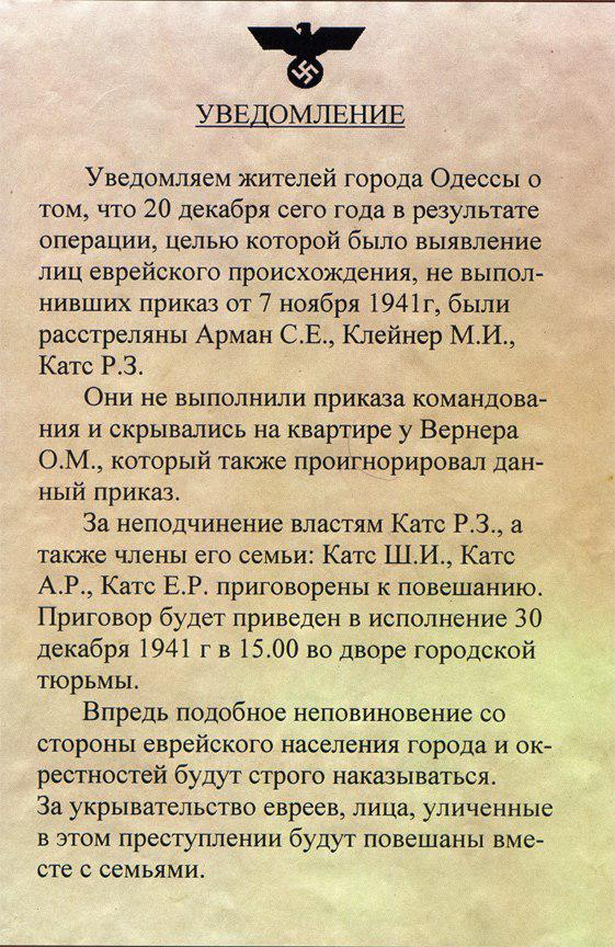 А после того, как была взорвана румынская комендатура на Маразлиевской — начались тотальные облавы и репрессии. Прохожих хватали на улицах и убивали. В пороховые склады на Люстдорфской дороге согнали 25 тысяч евреев и советских военнопленных, и были они заживо сожжены румынскими палачами. А дальше — пошла работать бесчеловечная мясорубка сбора тех же евреев в гетто, и высылка их в лютые лагеря смерти в Доманевке. Беляевке, Богдановке… Всего же было убито и замучено за годы оккупации порядка 100 тысяч человек!