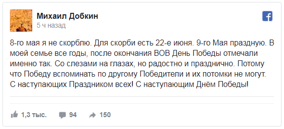 Украина наверное заслужила свой "праздник". Всех же остальных людей поздравляю с наступающим праздником 9 мая! Источник