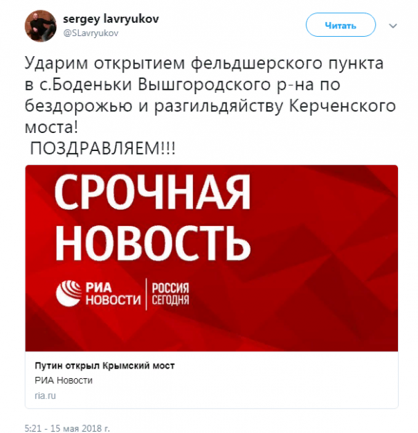 "Ударим открытием фельдшерского пункта в селе Боденьки Вышгородского района по бездорожью и разгильдяйству Керченского моста!" — написал @SLavryukov.