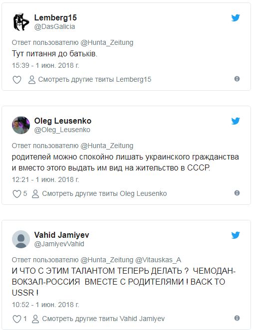 Пользователи соцсетей настолько разозлились на юную исполнительницу, что порой даже забывают о том, что она ребёнок. И если со страницы Евы в Instagram гневные комментарии исчезают быстро, то в Twitter остаются навсегда. Дошло до того, что жители Незалежной потребовали лишить родителей девочки украинского гражданства за то, что они "не сумели" правильно воспитать свою дочь.