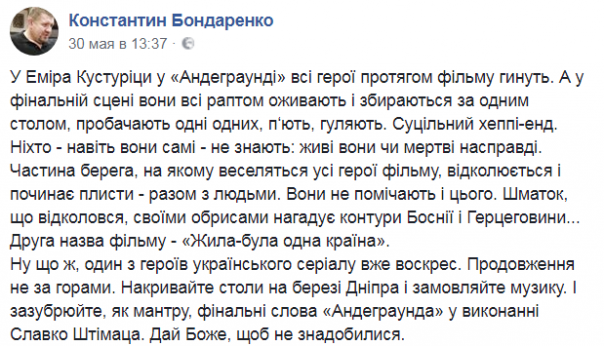 Ну что же, один из героев украинского сериала уже воскрес. Продолжение не за горами. Накрывайте столы на берегу Днепра и заказывайте музыку. И зазубривайте, как мантру, финальные слова «Андеграунда» в исполнении Слава Штимаца. Дай Бог, чтобы не понадобились".