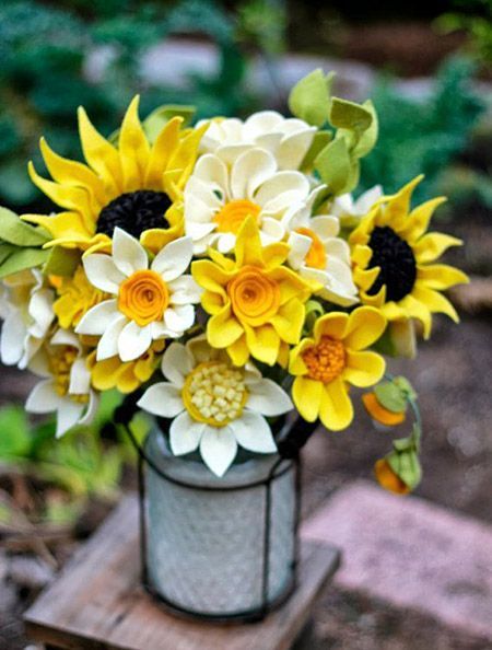 Обычно фигурки из фетра хотя и имеют скромные, незатейливые формы, но покоряют своей простотой и оригинальностью. Фетр настолько простой в работе, что с данной задачей без труда справится даже начинающий мастер. Из фетра можно изготовить как роскошные розы, хризантемы и пионы, так и простенькие ромашки. Работа не займет много времени, так как фетр является двусторонним материалом, а края фетра не осыпаются и не требуют никакой обработки, но если мастерица все же желает обшить края поделки, то можно использовать красивые акриловые нитки для вышивания в тон самой ткани. Довольно красиво смотрятся как однослойный или двуслойные цветочки, так и многослойные, а соединять фрагменты цветка можно про помощи самой обычной нитки и иголки или способом приклеивания (лучше клеевым пистолетом).