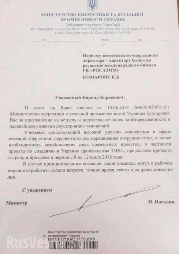«Учитывая необходимость возобновления ряда совместных проектов, в частности проекта по созданию на Украине производства ТВЭЛ, предлагаем провести встречу в Брюсселе в период с 9 по 12 июля», — говорится в документе.
