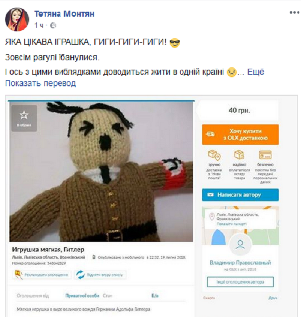 Через OLX можно приобрести мягкую игрушку «великого вождя Адольфа Гитлера», изготовленную львовскими умельцами.