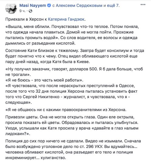 Как сообщают украинские СМИ — 31 июля утром в Херсоне напали на ахтивистку и скачущую особь из Херсонского горсовета, Екатерину Гандзюк...