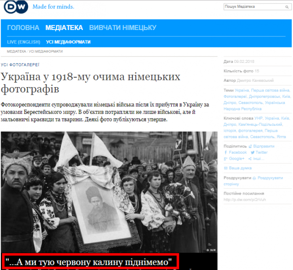 Красным обведены строчки из гимна УПА «Червона Калина» . При этом, заголовок ясно говорит, что о событиях тех лет и зверствах украинских националистов, о которых DW тупо умолчало, заменив на романтически-нейтральные снимки оккупации Украины солдатами Вермахта, немцам известно документально.