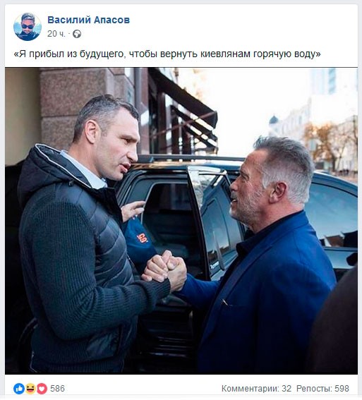 "Я прибыл из будущего, чтобы вернуть киевлянам горячую воду", — написал под фотографией журналист Владимр Апасов.