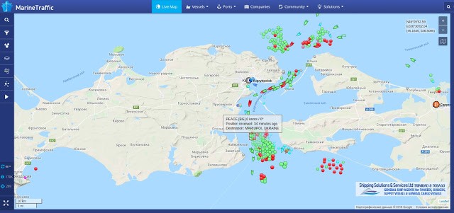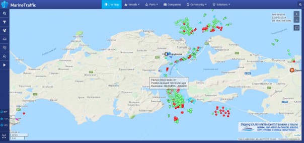 Также, как хорошо видно, что перед мостом столпотворение из судов, несколько десятков из которых имеют пункты назначения Бердянск и Мариуполь. Все эти суда стоят на рейде, блокированные береговой охраной ФСБ: