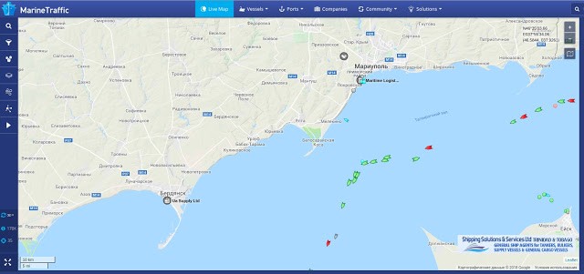 Более того, Бердянск (слово «порт» можно уже опустить) вообще чист, как слеза, ибо на причалах нет вообще ни одного судна, даже украинского. В Мариуполе у причалов болтаются только корыта под жовто-блакитними флагами и ни одного иностранного. Нет никого ни на подходах, ни на отходах, что хорошо видно на картинке ресурса MarineTraffic: