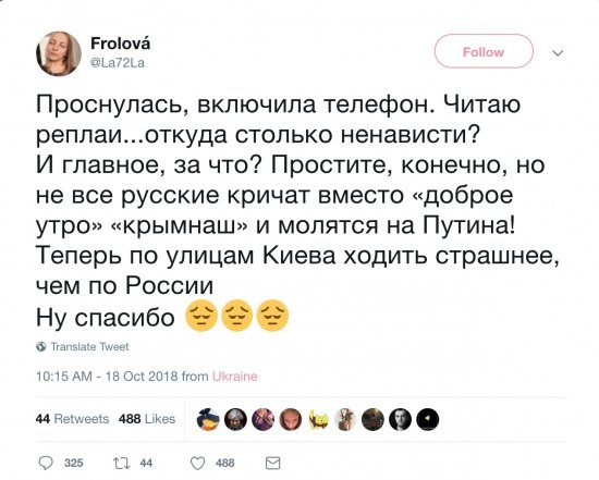Однако в украинской столице она продержалась недолго. Уже через сутки она написала, что сегодня по улицам Киева ходить намного страшнее, чем по улицам России.