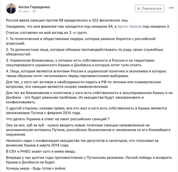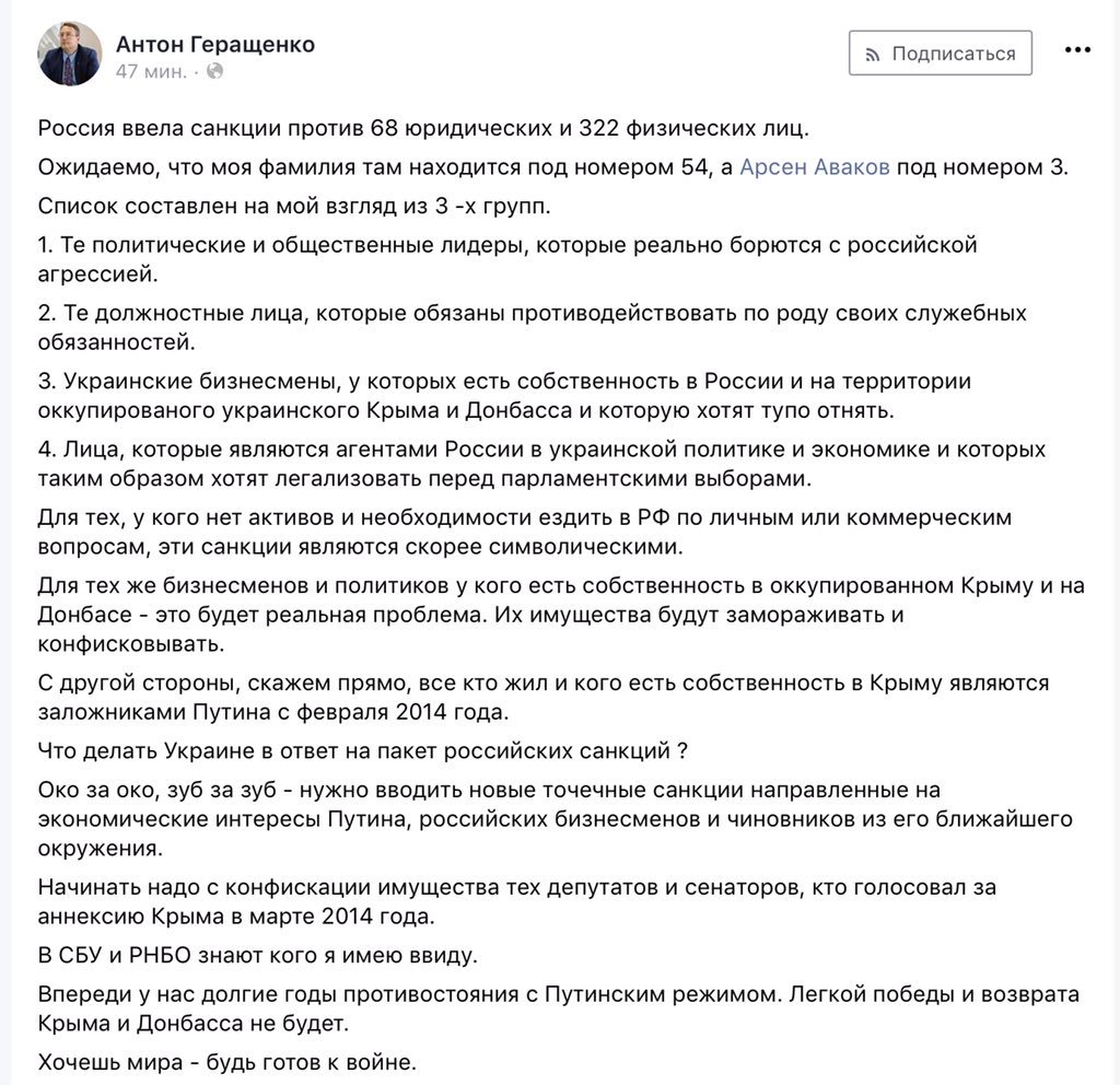 — Украине нужно готовиться к войне — истерит в фейсбуке Антон Геращенко, забыв о том, что он сам уже пятый год находится в перманентном состоянии гибридной войны с Россией;