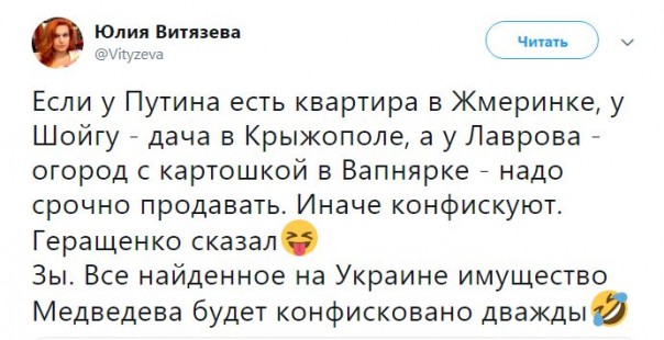 Опять таки, нищеброды типа Гаврилюка действительно попали в список исключительно из-за своей русофобии. Хотя, кто знает, может ему из Воркуты дальние родственники деньги иногда к празднику переводят. Теперь он такой возможности лишён. А вот всякие Луценки вполне могли иметь «свечной заводик» где-то под Ростовом, доступ к активам которого у них с сегодняшнего дня под запретом.