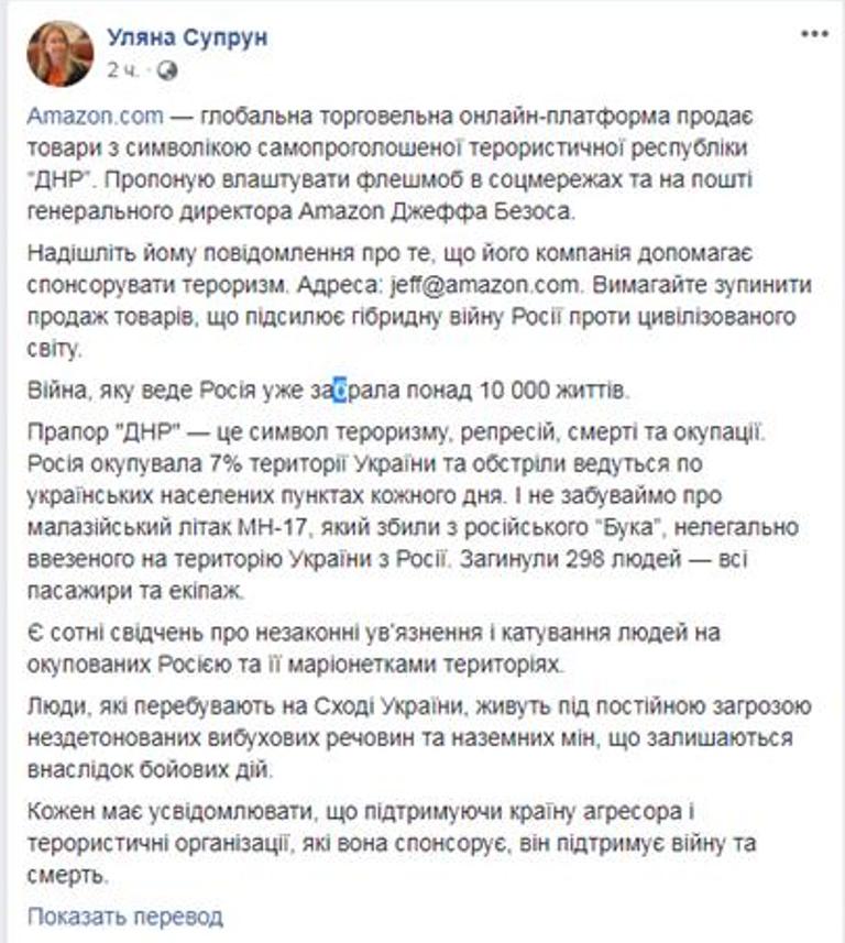 «Amazon.com — глобальная торговая онлайн-платформа продает товары с символикой самопровозглашенной террористической республики „ДНР“. Предлагаю устроить флешмоб в соцсетях и на почте генерального директора Amazon Джеффа Безоса», — пишет Супрун.