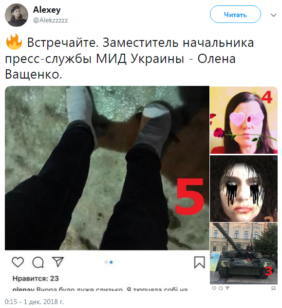 Но внимание интернет-пользователей привлекли не должности Ващенко, а ее страница в социальной сети Instagram, где появилась странная фотография. «Чем занималась представитель пресс-службы МИД Украины Олена Ващенко, когда корабли украинских ВМС Порошенко отправил в российские территориальные воды? Она надела носки поверх ботинок и пошла домой. Зачем? А зачем все остальное на Украине?» – передает сайт телеканала «360» сообщение одного из Telegram-каналов, обратившего внимание на соответствующую фотографию украинской чиновницы.
