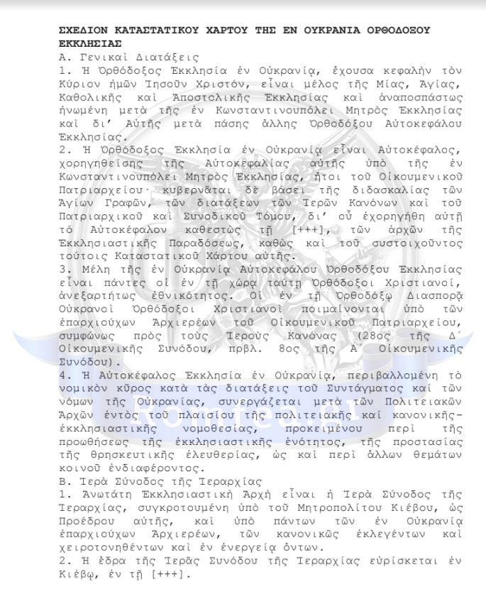 Первая страница проекта устава церкви Украины, который был утвержден Синодом Константинопольского патриархата