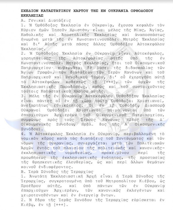 СМИ опубликовало одну страницу проекта устава "церкви Украины", который был утвержден синодом Константинопольского патриархата на заседании 27-29 ноября.