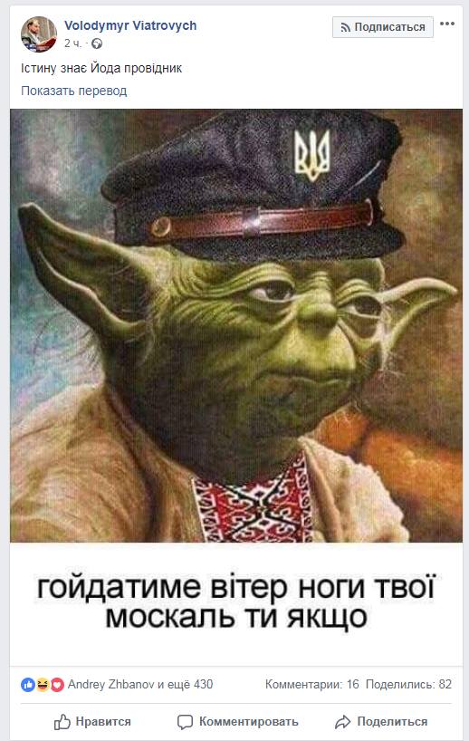 Украинский высокопоставленный чиновник – курирующий «декоммунизацию» глава т.н. «Института национальной памяти» Владимир Вятрович опубликовал в Facebook провокационный коллаж с изображением героя фильма «Звездные войны» Йоды в бандеровской фуражке и вышиванке и подписью «Качать будет ветер ноги твои москаль если ты». «Истину знает Йода проводник», – прокомментировал картинку чиновник.