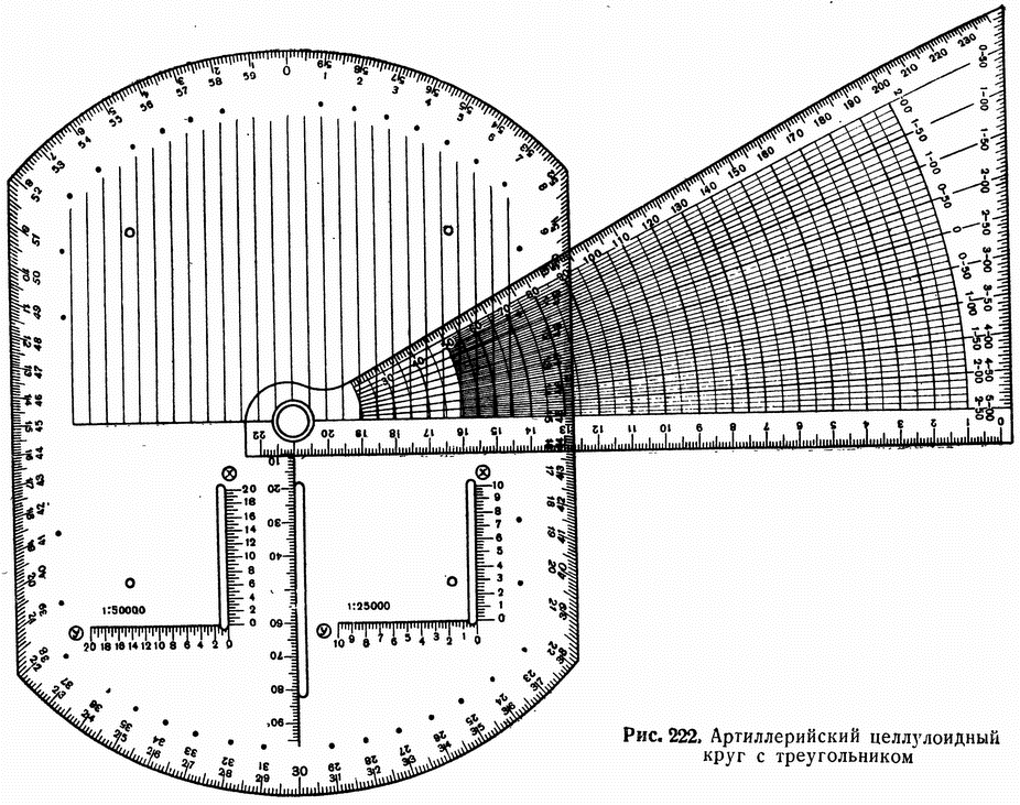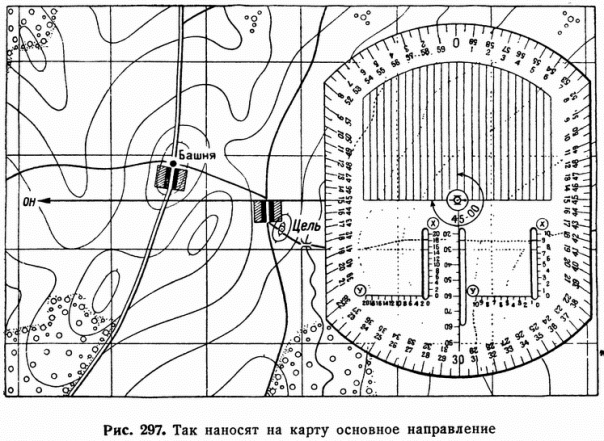 На рис – артиллерийский круг. Вверху 00-00 делений угломера – Север; Справа 15-00 д.у. – Восток; Внизу 30-00 д.у. – Юг; Слева 45-00 д.у. – Запад
