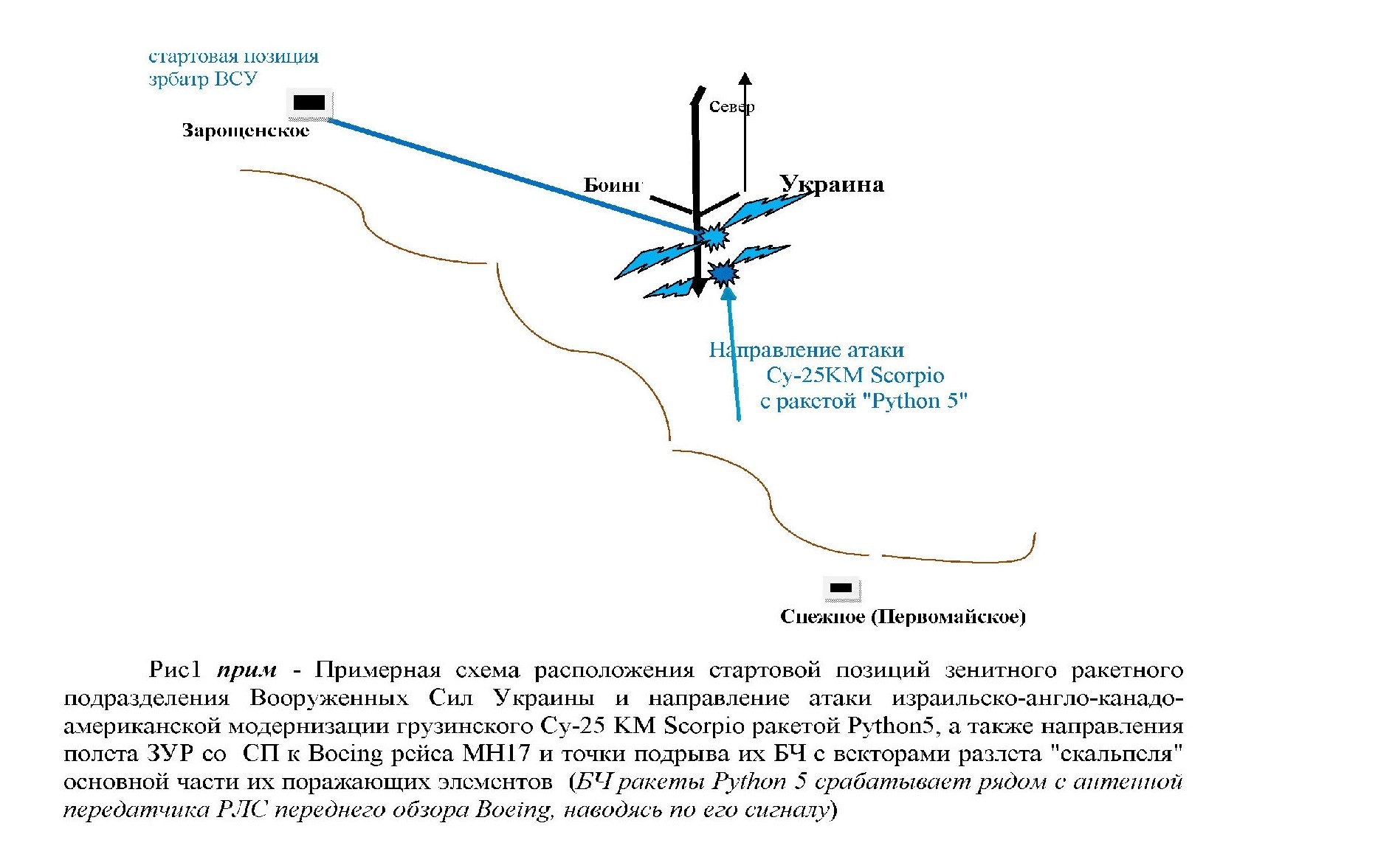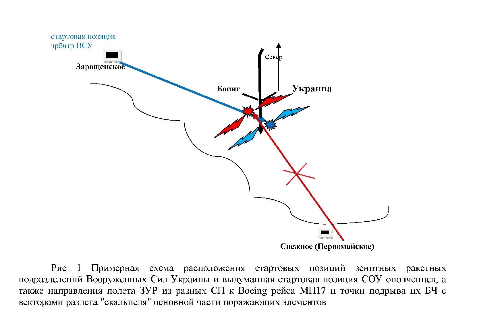 Смотрите на Рис 1, где схематично показаны условия направления полета ЗУР при их пуске с реальной СП ВСУ у Зарощенское и с поля у н.п. Снежное (или Первомайский, Первомайское). Учтите, положение самолета менялось в динамике – борт активно менял курс полета перед гибелью, разворачиваясь на юг, а значит имел меньшую обычной скорость полета.