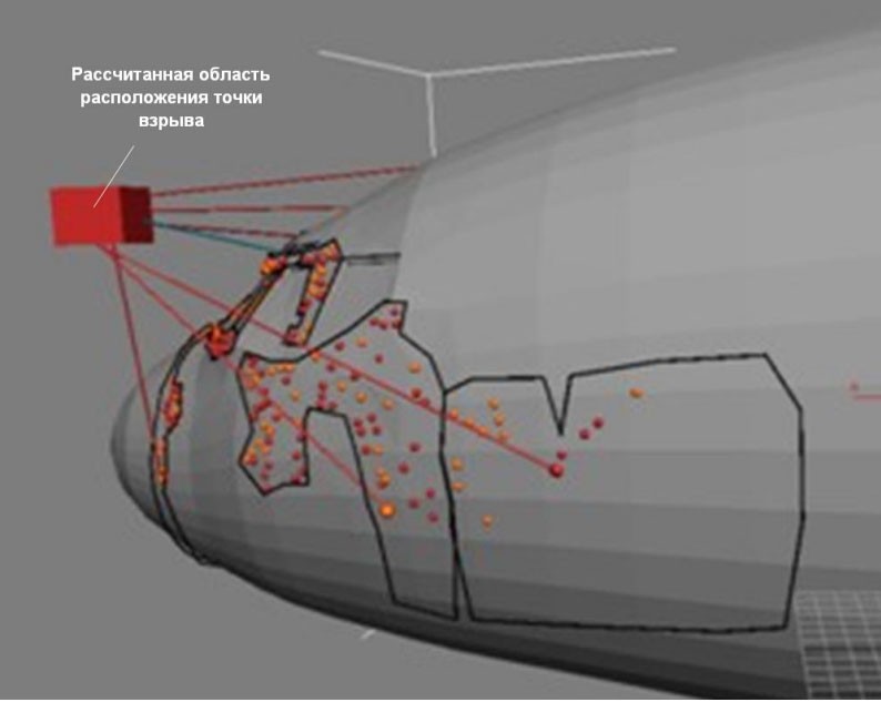 В результате исследования боевых повреждений было установлено, что самолет был поражен дистанционным средством поражения, имеющим осколочно-фугасную боевую часть массой от 10 до 40 кг, скорее всего снаряженную готовыми стальными поражающими элементами средней массой около 3 г с предположительной формой в виде параллелепипеда со сторонами 8х8х6 мм (с допуском ±0,5 мм) в количестве 2000…4000 шт. При этом взрыв боевой части произошел на расстоянии 0,8…1,6 м от форточки командира экипажа.