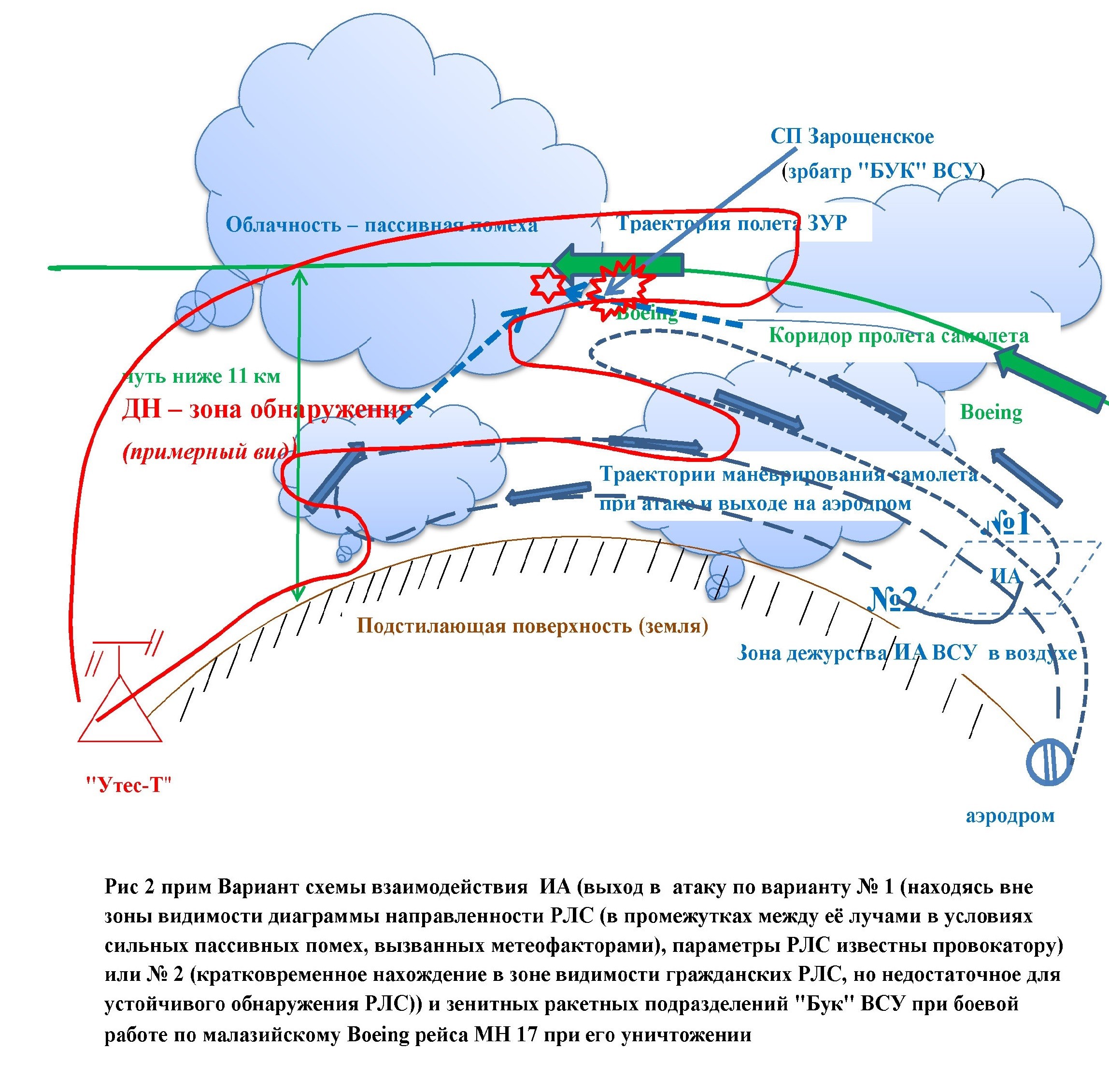 Boeing 777 рейса MH17 17 июля 2014 года на востоке Донецкой области Украины, в районе вооружённого противостояния между правительственными силами и формированиями Донецкой и Луганской народных республик, днепропетровский диспетчер вывел из коридора пролета рейсов международных авиалиний. Вывел с отклонением на 14 км на север от левой границы коридора на стандартном маршруте пролета не только с целью спрятать его за метеофакторами (грозовой облачности) и затруднить его наблюдение российским трассовым радиолокационным комплексом "Утес-Т" (уменьшить вероятность обнаружения атаки его истребителем и/или ударным ДПЛА), используемым в качестве гражданского локатора информации о воздушной обстановки в посёлке Усть-Донецкий (Ростовская область), то есть, чтобы максимально надежно скрыть от него пуск и полет ЗУР с зрбатр "БУК" ВСУ со стартовой позиции у н.п. Зарощенское и боевую работу по самолету украинского (грузинского) истребителя или американского истребителя-хамелеона (или же американского, израильского боевого ДПЛА с бортовым ракетно-пушечным вооружением на борту) с американской авиабазы Ramstein Air Base (Рамштайн) в ФРГ, но и, что также очень важно, с целью умышленного переименования его в подсистеме радиолокационной разведки и оповещения национальной системы ПВО Украины из ранее идентифицированного как самолет-"плановый коридорник", летящий по заявке", в боевую "Цель" с присвоением номера по системе оповещения о воздушной обстановке для дежурных по ПВО сил и средств Вооруженных Сил Украины, после чего они получили ЦУ на свои боевые средства.