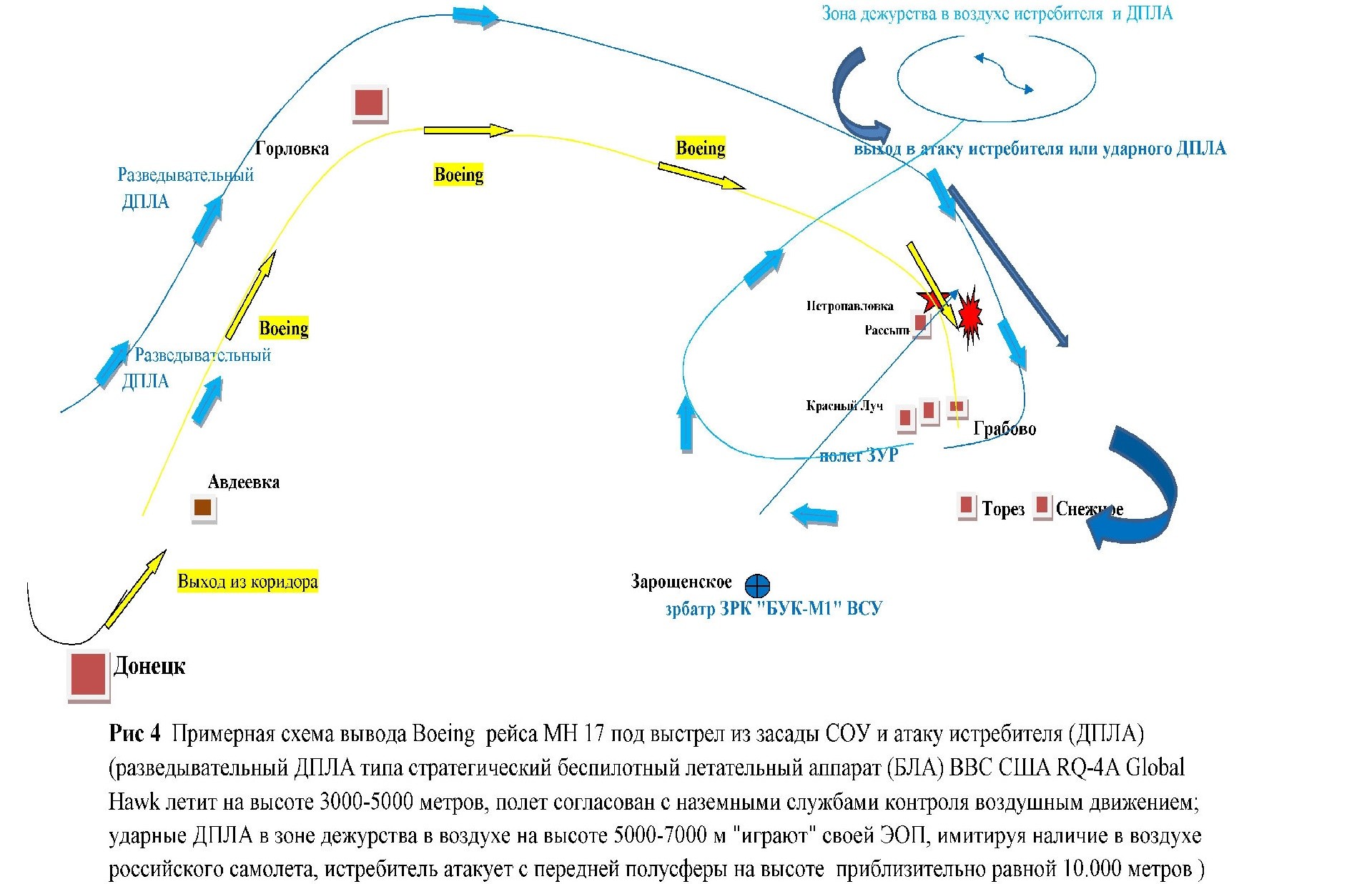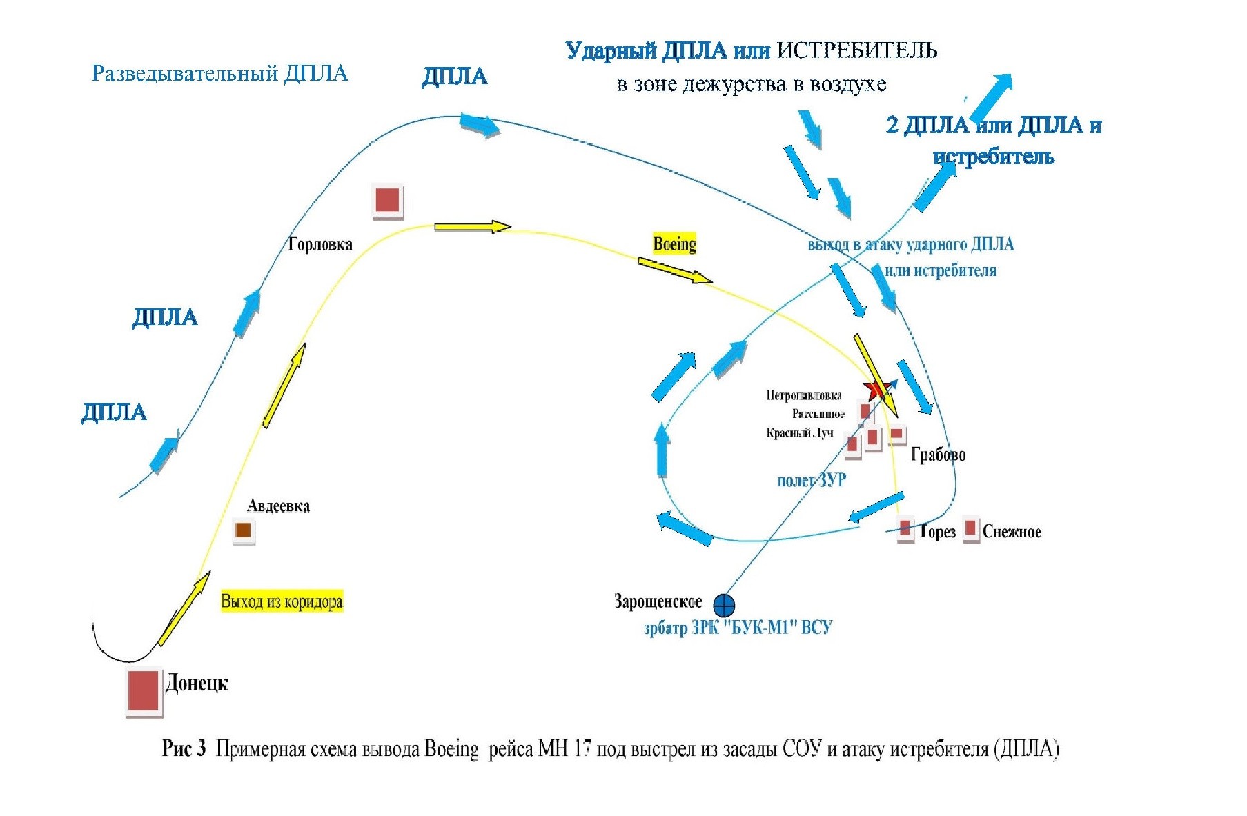 На Рис 3 отображена примерная схема вывода Boeing 777 рейса MH 17 под выстрел из засады СОУ и атаку истребителем (или беспилотником). Слева, рядом и ниже/выше гражданского самолета Boeing 777, фигурка синего самолетика – это летит разведывательный беспилотник криптпартнеров хунты, сопровождающий самолет Boeing 777, один из провокаторов катастрофы. Саму провокацию готовили несколько дней, изображая полеты российских самолетов и беспилотников в небе над Донбассом с помощью ДПЛА крипткураторов.