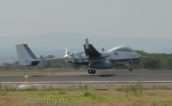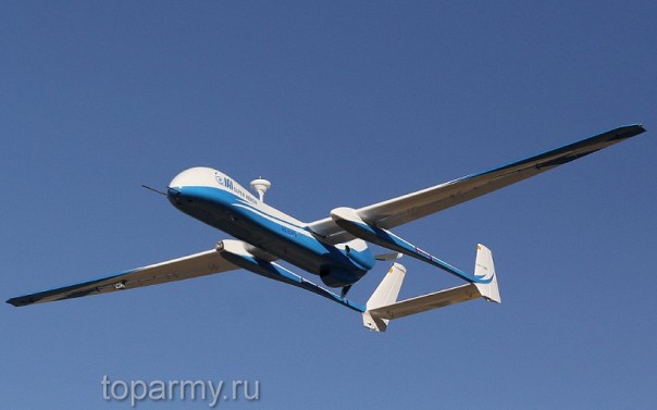 БПЛА Heron (Махац) – беспилотный разведывательный летательный аппарат, который на середину 2012 г. был самым продаваемым БПЛА производства Израиля. Работы по его созданию начались в начале 1990-х гг. совместно с американской фирмой TRW Inc. по одной из программ министерства обороны США. Один аппарат может отслеживать 6 целей одновременно, а также давать целеуказания истребителям, вертолетам и ракетам (!). При собственной массе 450 кг может нести 250 кг полезной нагрузки и 450 кг топлива. Максимальная взлетная масс может достигать 1150 кг. Двигатель ПД Rotax 914 F мощностью 115 л.с. обеспечивает полет с максимальной (крейсерской) скоростью до 240 (130) км/ч, беспилотник действует на дальности до 300 (1000) км при передаче данных в реальном масштабе времени (в автономном полете) в течение 46 ч на с практическим потолком 9150 м.