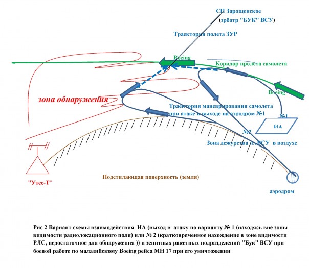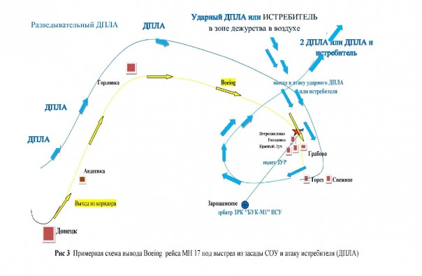 2 Организация дежурства в воздухе, по крайней мере двух, а лучше трех истребителей (в том числе, могли быть привлечены два разведывательных и один ударный БПЛА) в период вылета и пролета российских бортов (борта) по заявленному, как вариант, маршруту через Украину. Один истребитель (БПЛА) имел задачу из зоны дежурства в воздухе по команде с наземного КП сблизится с предполагаемым российским бортом для его визуальной идентификации – именно этот летчик (или оператор БПЛА) передал условленную фразу, что российский борт летит по маршруту в Ростов-на-Дону. Малазийский Boeing и российский борт имели похожие раскраски и конфигурацию планера, украинский летчик (скорее оператор БПЛА), не рискуя приблизиться слишком близко, ошибся и передал неверную информацию на землю.
