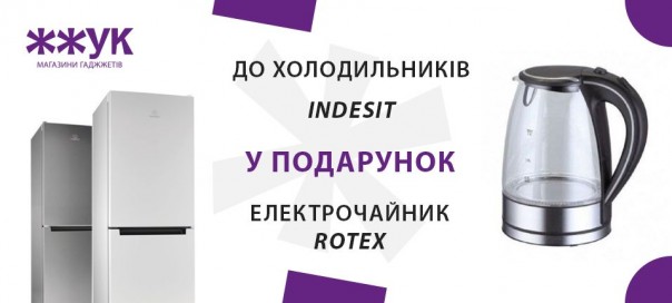 Купивши будь-який холодильник Indesit в інтернет-магазині «ЖЖУК», вам дістанеться безкоштовно (в подарунок) електрочайник Rotex RKT82-G, вартість якого поза акцією 500 грн.