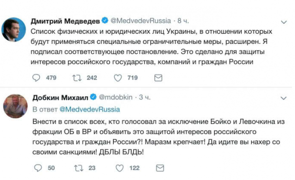 «Внести в список всех, кто голосовал за исключение Бойко и Левочкина из фракции ОБ в ВР и объявить это защитой интересов российского государства и граждан России?! Маразм крепчает! Да идите вы нахер со своими санкциями! ДБЛЫ БЛДЬ!», — написал Добкин под постом премьер–министра России Дмитрия Медведева в Twitter.