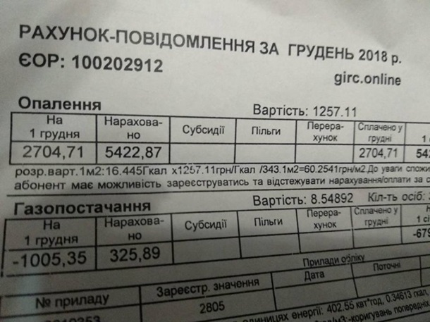 "Площадь 90 кв. Государственное отопление. Счетчик в доме. Как жить? Цена 5422 за декабрь. 60 грн/КВ/м", - сообщила девушка, прикрепив счет
