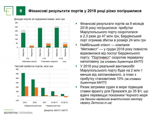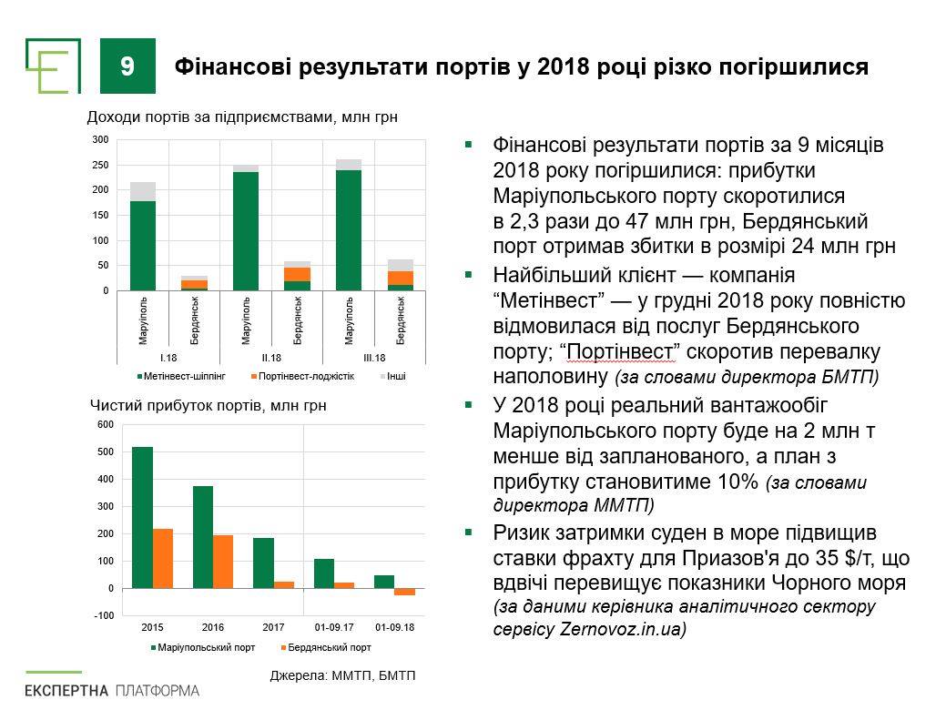 «Финансовые результаты портов за девять месяцев 2018 года ухудшились. Прибыль Мариупольского порта сократилась в 2,3 раза до 47 млн. грн. Бердянский порт получил убытки в размере 24 млн. грн. Реальный грузооборот Мариупольского порта будет на 2 млн. тонн меньше от запланированного, а план по прибыли составит 10%», – говорится в отчете.