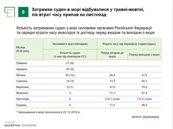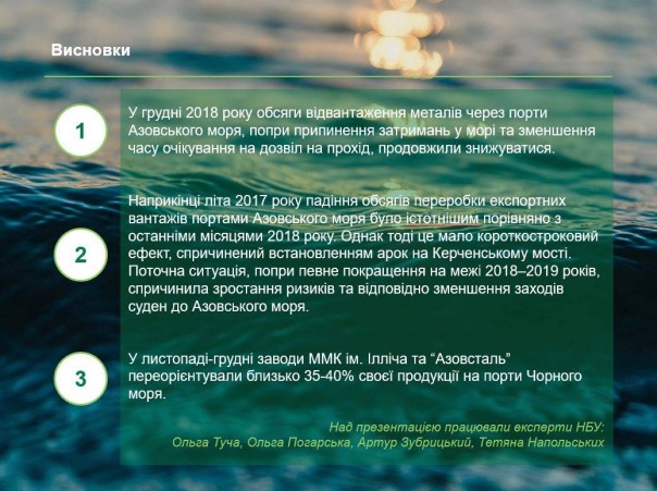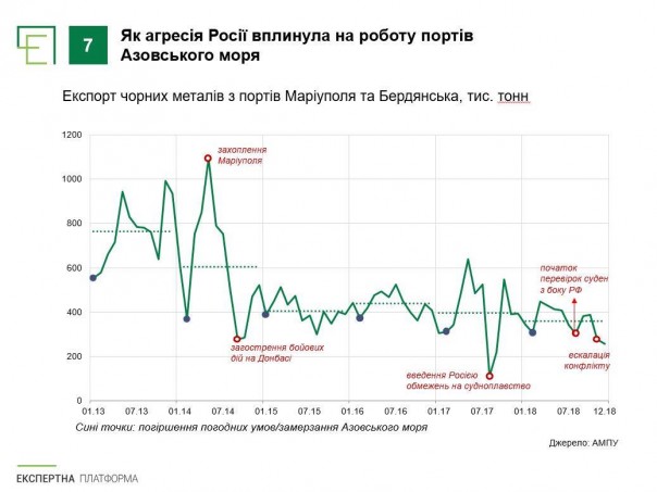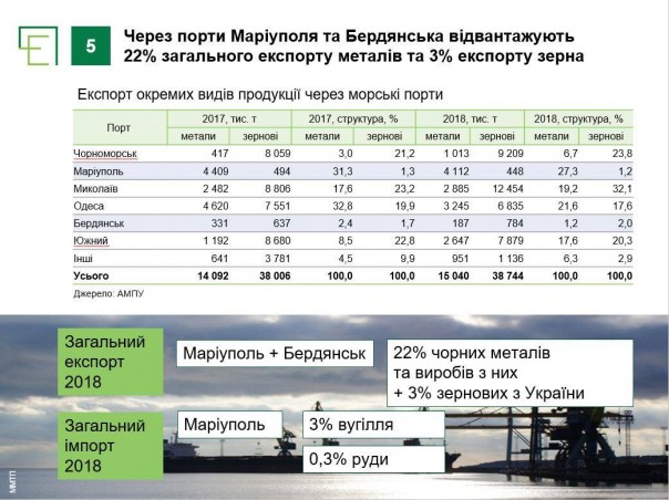 Сообщается, что грузопотоки в 2018-м году частично переориентировались из портов Азовского на порты Черного моря (так произошло с 35-40% продукции ММК имени Ильича и «Азовсталью», что увеличило транспортное плечо и ухудшило конкурентноспособность). Крупный металлургический холдинг «Метинвест» Рината Ахметова полностью отказался от обслуживания в Бердянском порту, а еще одно предприятие – «Портинвест» сократило перевалку вдвое.