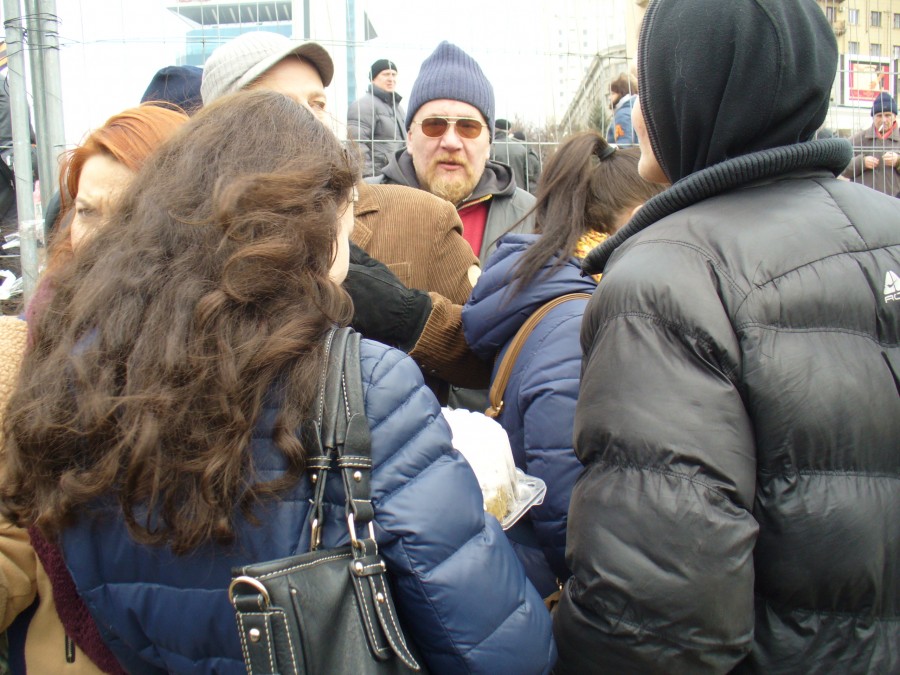 Девчата несут на площадь тортик для мерзнувших всю ночь парней. Мило, но бутерброд с колбасой лучше. Впрочем, сумки с бутербродами какие-то женщины принесли буквально перед ними.