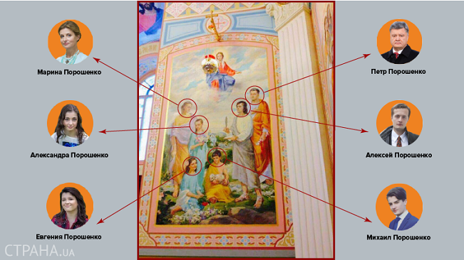 Стоит отметить, что Порошенко и сам считает себя «святым». По информации «Страны», на одной из стен в церкви, расположенной на территории землевладения президента в VIP-поселке Козин (Конча-Заспа), расположена фреска, на которой изображена семья Петра Порошенко.