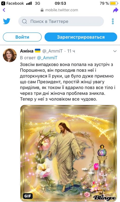 Так, некая Амина утверждает, что проходивший мимо её подруги Порошенко чудесным образом исцелил её от недуга.