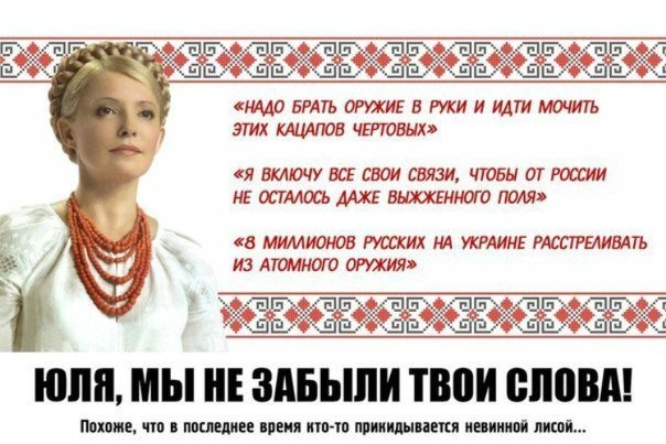 Еще два года назад, когда американцы начали активную работу с Юлией Владимировной, с прицелом ее использования на первых ролях в управлении Украиной, я сравнил ее с половой тряпкой, которая нужна будет только для зачистки постмайданной шелухи и выводу на первые роли новых, незапятнанных кровью и воровством, лиц. Похоже, я не ошибся. А у самой Тимошенко другого выхода нет, как выполнить волю хозяина. Не там яичко снесла. Будет это так или иначе, покажет будущее. Одно можно сказать, что украинскому народу от этого точно хорошо не будет.