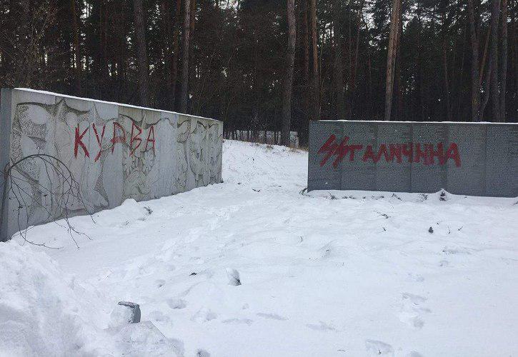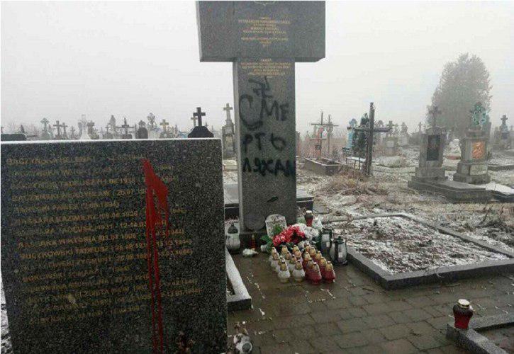 Через месяц на восстановленном мемориале появилась нарисованные красная свастика и чёрный тризуб. А на стелах с фамилиями жертв преступления надписи: «Смерть ляхам!» и «Вон с Украины!».