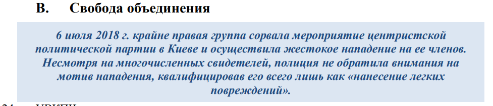 В документе говорится, что в период с января 2018 года по январь 2019 года на Украине сложилась тенденция "жестоких нападений и актов запугивания" в отношении журналистов и гражданских активистов.