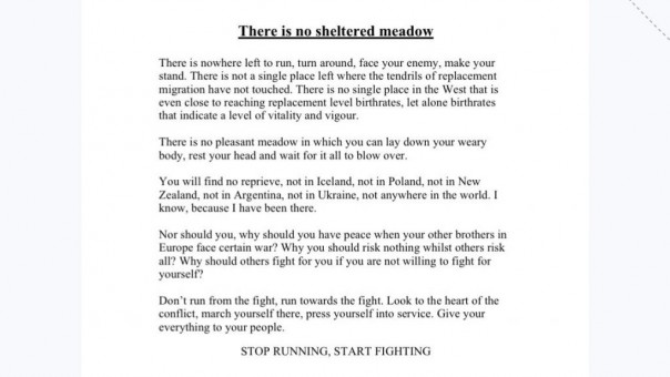 «Вы не найдете передышки ни в Исландии, ни в Польше, ни в Новой Зеландии, ни в Аргентине, ни в Украине, ни где-либо в мире, я знаю, потому что я был там”, – говорится в манифесте террориста.