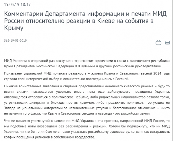 МИД России вернул Украине ноту протеста из-за поездки Путина в Крым