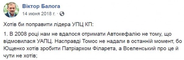О том, что «СЦУ» не «новая церковь», а всё та же «УПЦ-МП», «Филарет» поведал «ближнему кругу» на застолье в честь собственного 90-летия. «Это церковь не новая, а церковь, которая существует больше 25 лет, – слышно на аудиозаписи, слитой «ближним кругом» в интернет в тот же день. – И если бы не было этой церкви Киевского патриархата, то кому томос давать – этим двум московским архиереям без приходов (Драбынко и Симеону, от которого отреклось винницкое священство и паства, – Д.С.)? Или Автокефальной церкви («УАПЦ», – Д.С.), в которой 500 приходов? Ясно, что дали томос Киевскому патриархату… Потому от этой терминологии, что это новая Церковь, нужно отказываться и ее не употреблять».