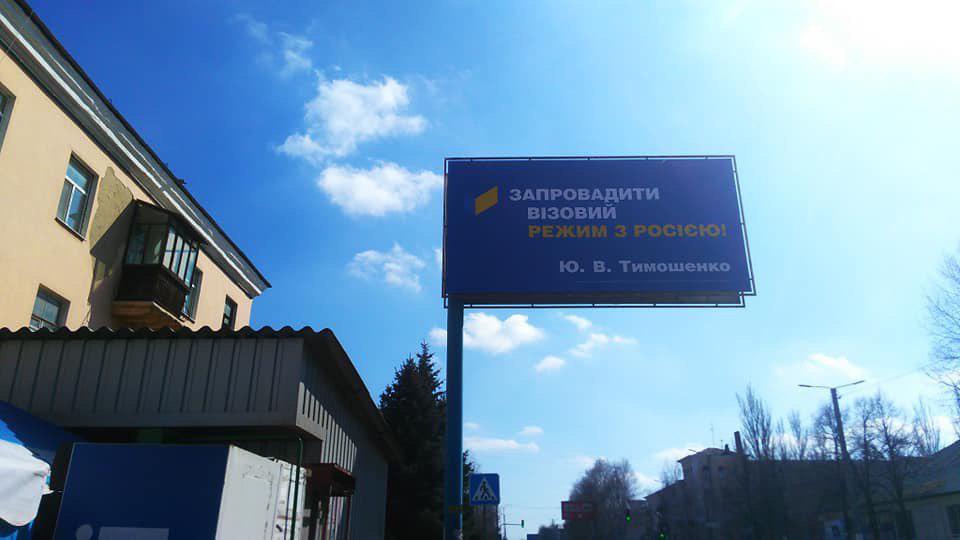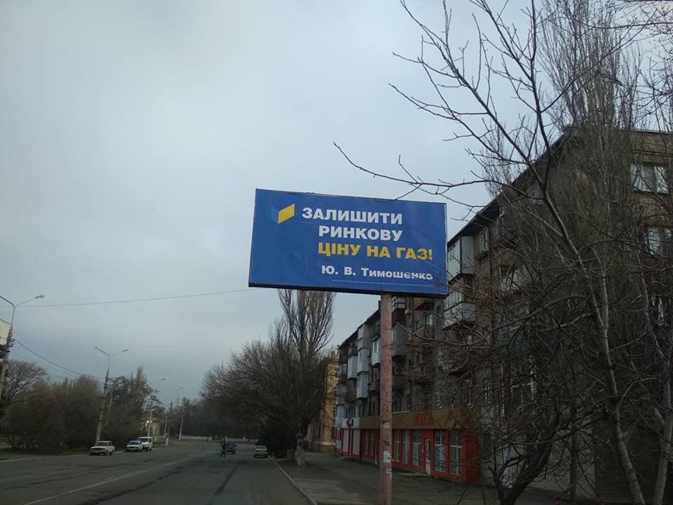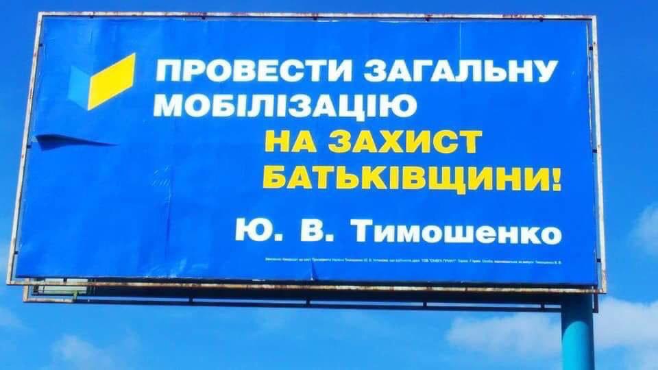 На билбордах, Юрий Тимошенко обещает провести всеобщую мобилизацию и оставить рыночную цену на газ.