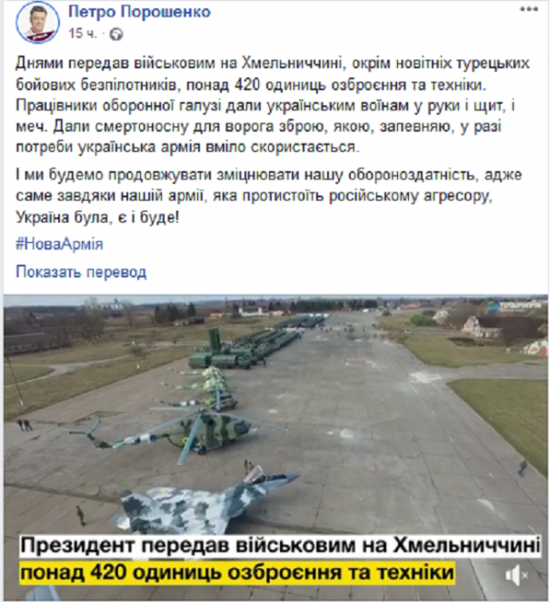 На днях в Хмельницкой области президент Украины Пётр Порошенко передал военным более 420 единиц вооружения и техники — «смертоносного оружия», которое может быть применено против врага в случае необходимости.