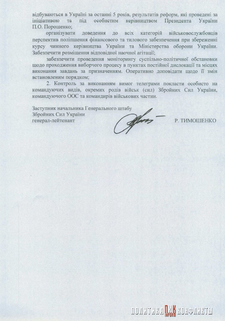 Украинская хакерская группа «Спрут» опубликовала текст приказа под грифом «Секретно» за подписью замначальника Генштаба ВСУ генерала Тимошенко. В документе военный доводит адресантам о катастрофическом положении дел по результатам голосования в первом туре президентских выборов, в которых действующий президент в некоторых подразделениях ВСУ на Донбассе набрал всего от 16 до 22% голосов военнослужащих.