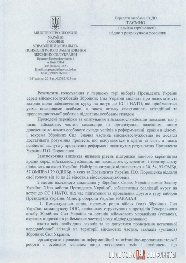 принять все необходимые меры и не допустить проведения негативной предвыборной агитации на территории воинских частей, заведений (учреждений) Вооруженных Сил Украины;