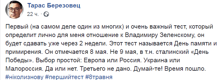 Вопрос, как по мне, очень правильный и интересный, как для нациков, так и для здравомыслящей части Украины. И это не единственный тест, который Зеленский должен будет пройти до 9-го мая.