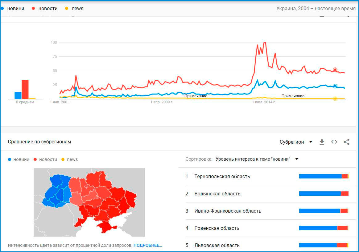 Один сепар, наверняка прикидывающийся глухонемым, провел исследование запросов в Google на украинском и русском языках. И вот что у него получилось.